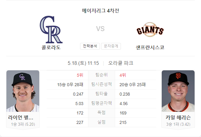 콜로라도 로키스는 최근 상승세를 타고 있으며, 라이언 펠트너가 안정적인 투구를 보여주고 있습니다. 반면 샌프란시스코 자이언츠는 타격과 투수진 모두 불안정한 모습을 보이고 있습니다.