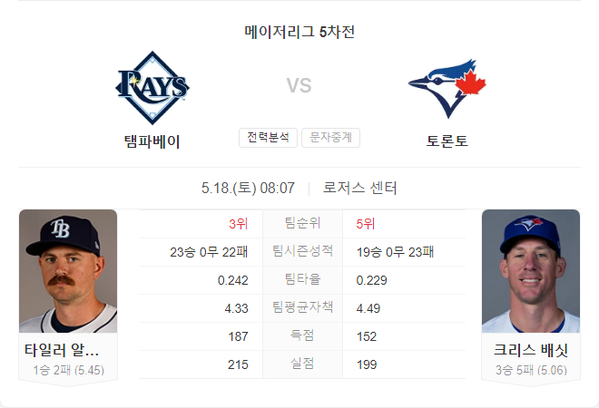 토론토 블루제이스는 현재 아메리칸 리그 동부지구에서 19승 23패로 최하위를 기록하고 있습니다. 블루제이스는 최근 볼티모어 오리올스와의 2연전을 1승 1패로 마무리하고 하루 쉬었습니다. 이번 시리즈에서는 탬파베이 레이스와의 경기를 통해 승리를 거두고자 합니다. 최근 경기에서 보 비셋이 2타점 2루타를 기록했지만, 팀은 3-2로 패배했습니다. 비셋은 현재 타율 0.215, 홈런 2개, 타점 15개를 기록 중입니다.
