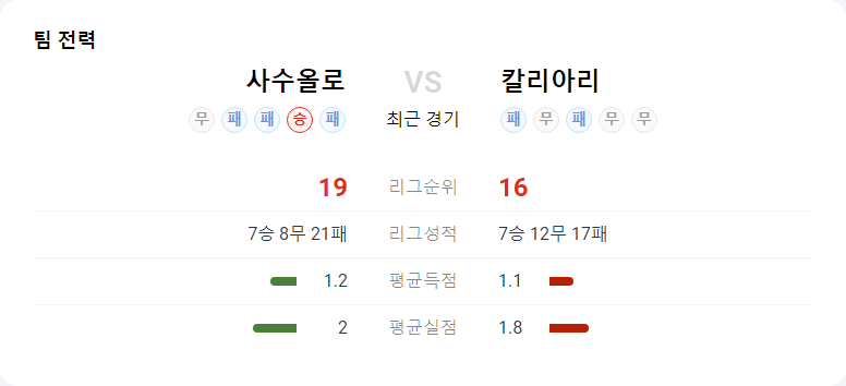 사수올로는 공격적으로 경기를 펼치며 칼리아리를 강하게 압박할 것으로 보인다. 그러나 사수올로의 수비 불안정성이 실점으로 이어질 가능성도 있다. 반면, 칼리아리는 원정 경기에서의 약점을 드러낼 것으로 예상된다. 사수올로의 강한 공격력과 칼리아리의 원정 경기 불안정성을 고려할 때, 사수올로가 우세할 가능성이 높다.