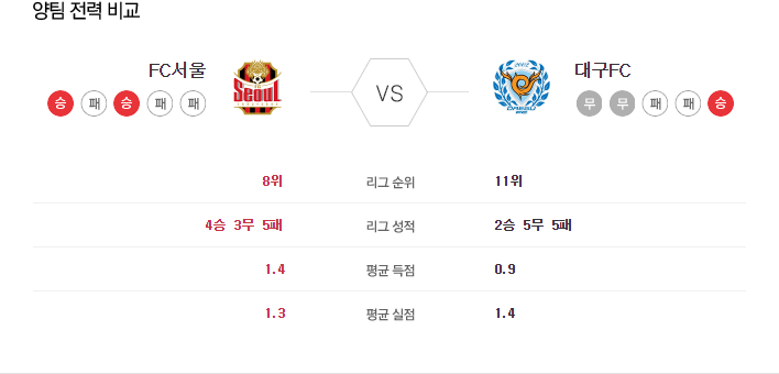 서울은 현재 대한민국 1부 리그에서 6위에 위치해 있으며, 최근 5경기에서 승패승패승의 성적을 기록하고 있습니다. 대구를 상대로는 다소 약한 모습을 보여왔습니다. 대구가 수비와 역습 전략을 대놓고 사용할 때, 서울은 이에 매우 고전했습니다. 실제로 인천과의 경기에서도 제르소가 퇴장당하기 전까지는 감을 잘 잡지 못하는 모습이었습니다.