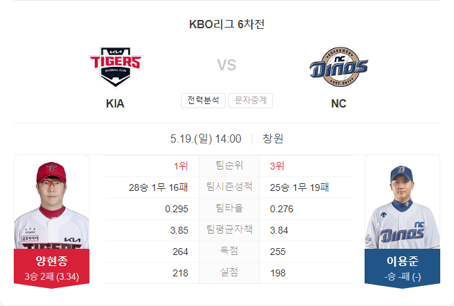 특히, 작년 KIA 상대로 부진했던 투수라 이번 경기에 대한 기대는 크지 않습니다. 전날 경기에서 1회말 맷 데이비슨의 2점 홈런이 득점의 전부였던 NC의 타선은 이번 시리즈에서 집중력 부족이 문제로 지적되고 있습니다.