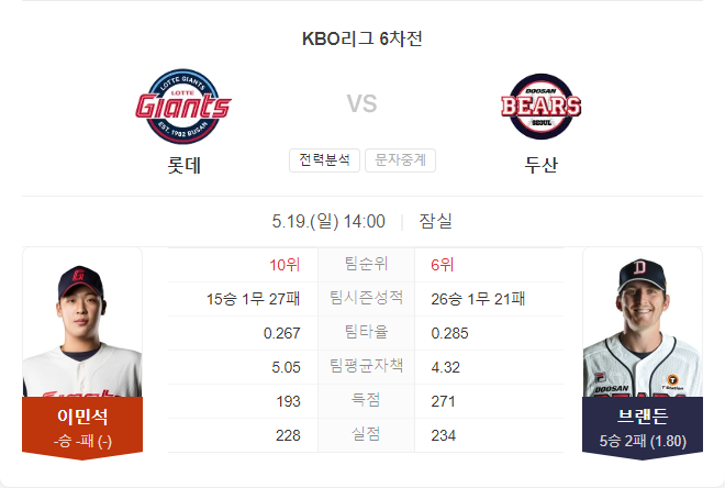 전날 경기는 두산의 홈런포로 모든 것이 결정되었습니다. 이번 경기 역시 두산의 타선이 강력한 모습을 이어갈 가능성이 큽니다. 브랜든 와델은 현역 최강의 롯데 킬러로, 홈 경기에서 더욱 강점을 보일 것으로 예상됩니다.