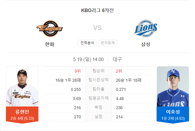 전날 경기에서 삼성은 강팀으로서의 면모를 보여주었습니다. 동점과 역전 상황에서 홈런과 적시타가 나오는 것이 현재 삼성의 강점입니다. 한화 역시 전날 경기에서 타격이 좋았지만, 이호성과의 승부가 될 것으로 보입니다. 류현진은 원정 경기에서 부진한 모습을 보였고, 이번 경기는 개막 후 첫 낮 경기라는 변수가 있습니다.