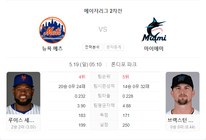 뉴욕 메츠는 이번 시즌 20승 23패를 기록하며 중위권에 머물러 있다. 팀의 선발 투수 루이스 세베리노는 이번 경기에서 세 번째 승리를 노리고 있다. 세베리노는 최근 애틀랜타 브레이브스를 상대로 5이닝 동안 2실점으로 호투하며 좋은 모습을 보였다.