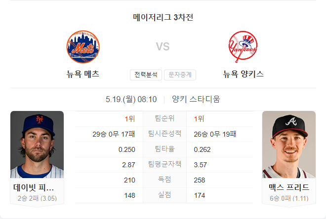 5월 19일 MLB 메이저리그 뉴욕 메츠 VS 뉴욕 양키스 타카짱의 경기 예측 분석