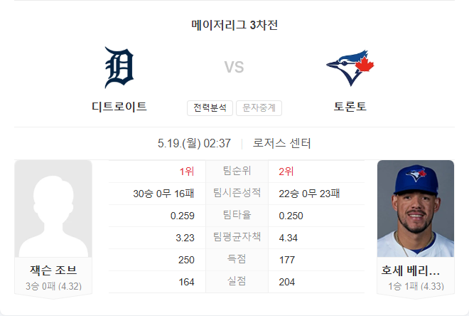 5월 19일 MLB 메이저리그 디트로이트 타이거즈 VS 토론토 블루제이스 타카짱의 경기 예측 분석