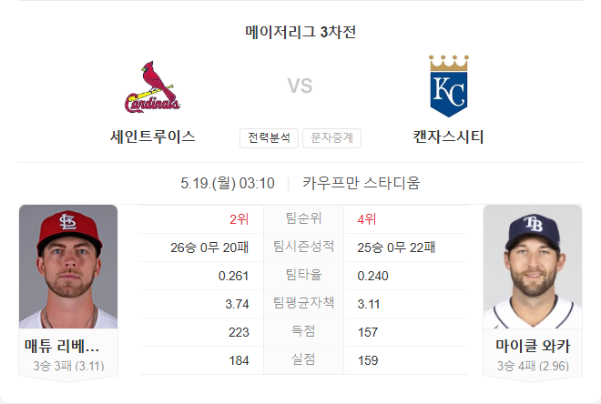 일요일 선발은 마이클 와카입니다. 그는 시즌 3승 4패, 평균자책점 2.96을 기록 중이며, 직전 휴스턴전에서는 6.1이닝 2실점으로 승리를 챙겼습니다.와카는 세인트루이스를 상대로 통산 4경기에서 4승 무패, 평균자책점 2.96으로 매우 강한 모습을 보이고 있습니다.