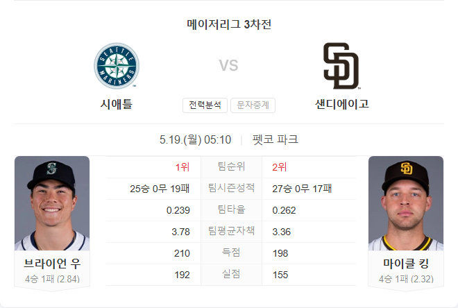 두 팀 모두 리그 상위권 선발을 내세우는 매치업입니다. 브라이언 우는 WHIP, 피안타율, 최근 투구 내용 모두 안정적이며 샌디에이고 상대 좋은 기억도 있습니다. 킹 역시 시즌 성적은 훌륭하지만, 시애틀을 상대로는 유독 승운이 따르지 않는 모습이었습니다. 불펜 난조와 상대 전적을 고려할 때, 시애틀이 원정에서 우위를 점할 가능성이 높습니다.