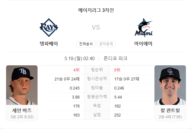 탬파베이는 전날 경기에서 타선이 다시 살아났고, 선발 바즈의 기복 있는 투구에도 불구하고 불펜의 뒷받침이 충분한 팀입니다. 마이애미는 스토워스와 노르비의 활약이 변수지만, 퀀트릴의 불안한 피칭이 가장 큰 리스크로 작용할 전망입니다.