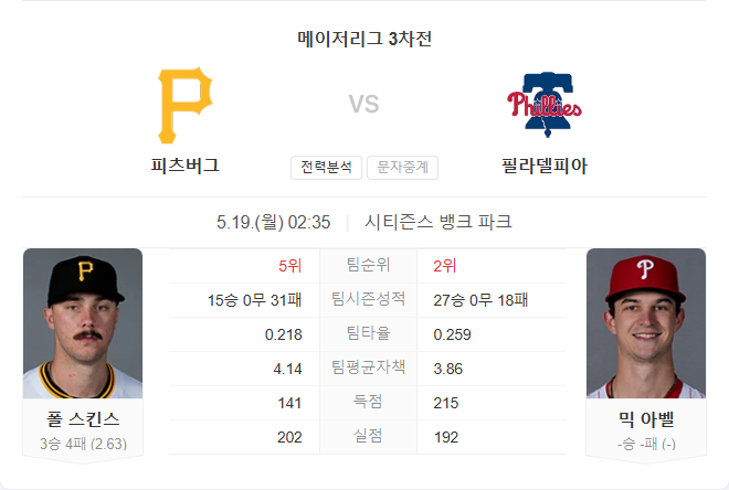 피츠버그는 에이스 스키너스의 등판으로 마운드에서는 기대를 걸 수 있지만, 타선의 득점 지원이 불안정하다는 점에서 여전히 승리 확률은 낮은 편입니다. 반면 필라델피아는 데뷔전을 치르는 아벨의 등판이 변수이지만, 최근 기세와 타선의 집중력을 고려할 때 전력 우위를 점하고 있습니다.