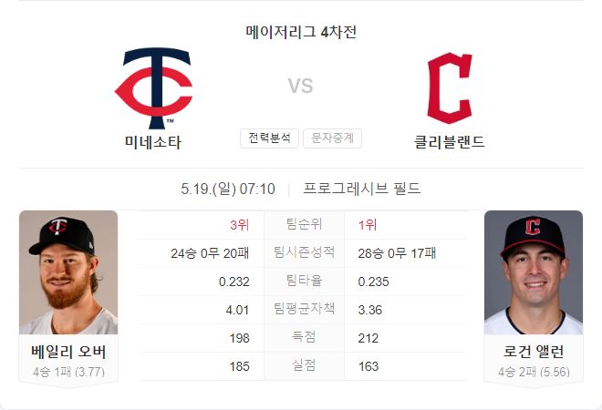 미네소타는 팀 타율이 .234로 리그 19위에 머물러 있으며, 장타율은 .397로 9위에 위치해 있다. 투수진에서는 팀 ERA 4.03으로 리그 17위, WHIP는 1.23으로 11위를 기록하고 있다. 선발 투수 베일리 오버는 이번 시즌 4승 1패, 3.77 ERA와 0.88 WHIP를 기록하며 안정적인 모습을 보이고 있다.