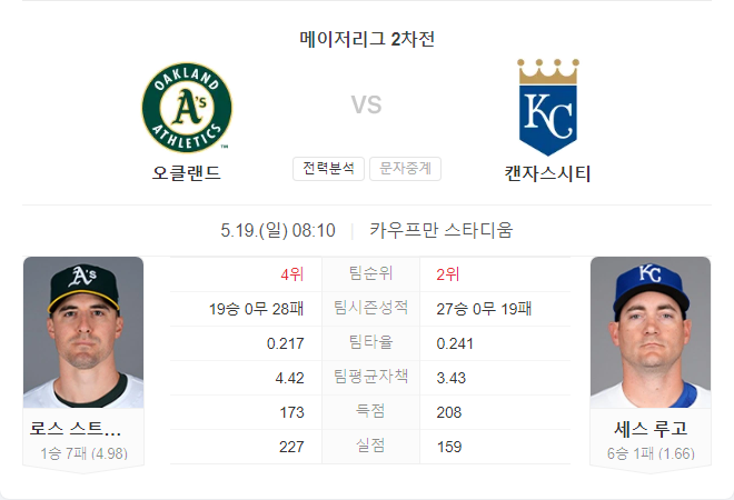 반면, 오클랜드 어슬레틱스는 최근 6연패로 어려움을 겪고 있으며, 로스 스트립링의 성적이 다소 부진한 상태다. 또한, 로열스의 타선은 최근 좋은 성적을 이어가고 있어 어슬레틱스의 투수진을 상대로도 강한 모습을 보일 것으로 보인다.