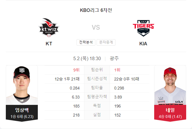 기아 타이거즈는 에이스 제임스 네일이 연승에 도전하며 마운드에 오릅니다. 최근 LG 원정에서 5이닝 4실점으로 다소 부진했던 네일이지만 홈에서의 강점과 KT 원정에서의 6이닝 1실점 호투는 이번 경기에서 기대를 걸게 합니다.