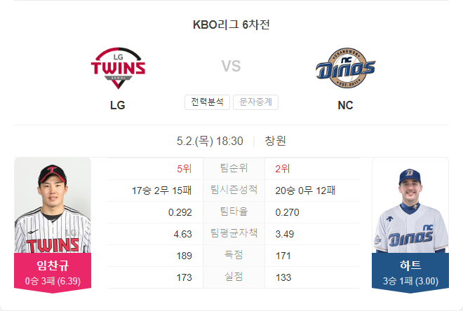 5월 2일 KBO 프로야구 LG 트윈스 VS NC 다이노스 타카짱의 경기 예측 분석