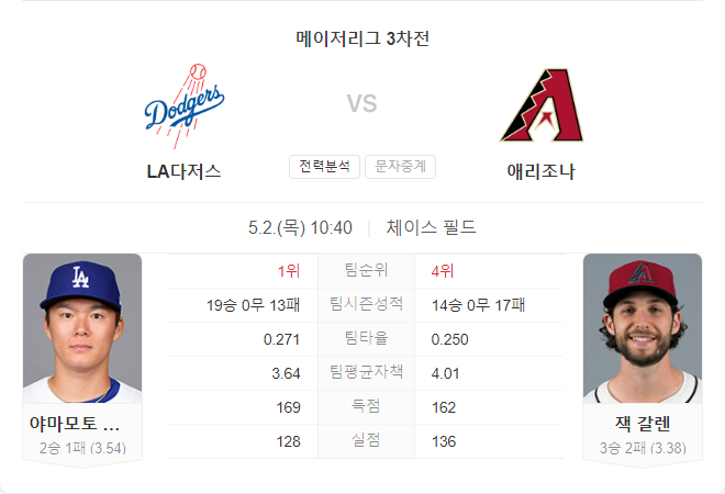5월 2일 MLB LA 다저스 VS 애리조나 다이아몬드백스 타카짱의 경기 예측 분석