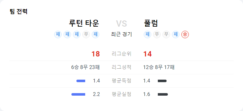 라인을 올려 압박하는 플레이를 즐기지만, 체급 상 맞불 상황에서는 결과가 좋지 않은 경우가 많습니다. 특히 풀럼을 상대로는 약한 모습을 보여왔으며, 풀럼 역시 라인을 올려 공격하는 빈도가 높아 루턴에게는 어려운 경기가 예상됩니다.