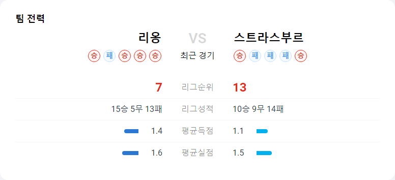 리옹은 현재 리그 7위에 위치하며 최근 5경기에서 4승 1패의 성적을 기록하고 있습니다. 스트라스부르를 상대로 최근 약간 헤매는 모습을 보였는데, 이는 스트라스부르가 압박과 수비에 강점을 가진 팀이기 때문입니다.