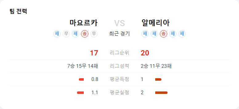 최근 두 팀의 맞대결에서는 마요르카가 알메리아를 상대로 우세한 경기를 펼쳐왔습니다. 마요르카의 전술적 우위와 높은 기술력이 알메리아의 수비를 여러 차례 무너뜨렸으며, 유리한 결과를 얻어냈습니다. 이번 경기에서 마요르카는 홈 이점을 최대한 활용하여 경기를 주도할 것으로 보입니다.