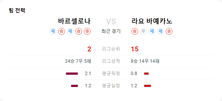 특히 페르민은 최근 5경기에서 4골을 기록하며 중원에서의 활약이 두드러집니다. 역사적으로 바르셀로나는 두줄 수비를 잘 공략해왔기에, 라요 바예카노와의 홈 경기는 크게 부담스럽지 않을 것으로 보입니다.