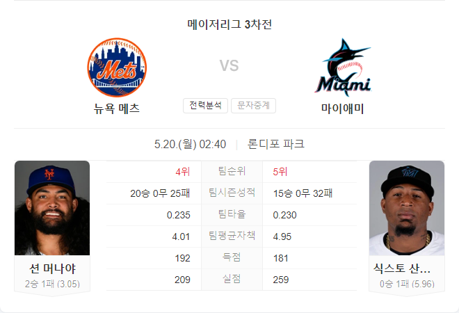 뉴욕 메츠는 최근 부진한 모습을 보이고 있지만, 션 마나에아의 안정적인 투구와 팀의 공격력이 이번 경기에서 반등할 가능성이 있습니다. 반면, 마이애미 말린스는 최근 3경기 연속 무실점 승리를 기록하며 상승세를 타고 있지만, 식스토 산체스의 불안정한 투구로 인해 어려운 경기가 예상됩니다.