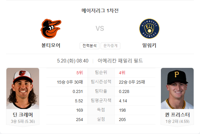 오리올스는 감독 교체 이후 첫 시리즈를 맞이하며 분위기 반전을 노리지만, 크레머의 기복 있는 피칭과 팀 전반적인 부진은 불안 요소입니다. 반면 브루어스는 프리스터의 최근 호투와 홈 이점을 앞세워 연승을 노릴 수 있는 입장입니다. 양 팀 모두 불안 요소가 많지만, 홈에서 비교적 안정적인 경기력을 보이는 밀워키가 조금 더 우세한 경기를 펼칠 가능성이 높습니다.