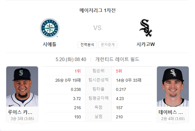 전력차는 명확합니다. 매리너스는 선발 싸움과 타선의 집중력 모두에서 화이트삭스를 앞서고 있으며, 최근 시리즈에서도 반등에 성공한 만큼 상승세를 이어갈 가능성이 높습니다. 카스티요가 시카고에 강한 면모를 보였다는 점도 긍정적입니다. 반면, 화이트삭스는 홈에서 약간의 저항은 가능하지만, 빈약한 타선으로 인해 승리 가능성은 낮아 보입니다.