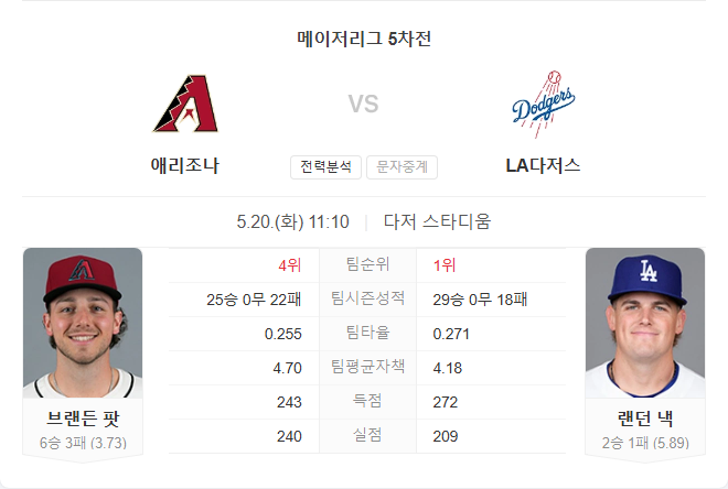 이날 선발로 나서는 랜든 낙은 시즌 5경기(4선발)에서 2승 1패, 평균자책점 5.89, WHIP 1.527을 기록 중입니다. 직전 등판에서는 오클랜드를 상대로 4.2이닝 5실점하며 흔들렸습니다. 다이아몬드백스를 상대로는 통산 2경기 0승 1패, 평균자책점 4.82를 기록 중이며, 다저스타디움에서는 통산 9경기 1승 5패, 평균자책점 4.40으로 홈 성적이 좋지 않습니다.