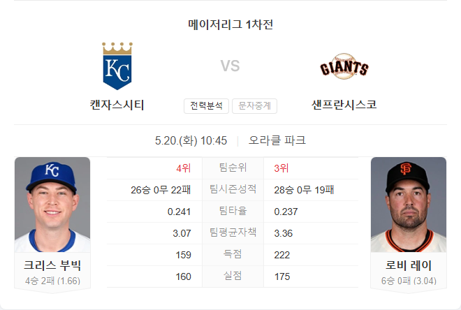 양 팀 모두 좌완 에이스가 선발로 나서며 투수전 양상이 예상됩니다. 로열스는 극심한 타격 부진으로 인해 마운드의 호투에도 연패를 끊지 못하고 있으며, 이번 경기 역시 공격에서 돌파구를 마련하지 못할 경우 고전이 불가피합니다. 자이언츠는 안정적인 불펜과 로비 레이의 좋은 흐름에 힘입어 홈경기에서 유리한 위치를 점하고 있습니다.