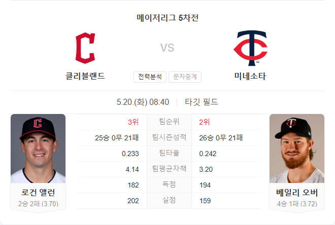 클리블랜드는 타격과 마운드 양 측면에서 모두 불안한 모습을 보이고 있으며, 특히 최근 연패로 분위기가 좋지 않습니다. 반면 미네소타는 13연승을 기록하며 최고의 흐름을 보이고 있고, 오버가 선발로 나서 안정적인 마운드 운용이 기대됩니다. 타선도 고르게 활약 중인 만큼, 홈에서 좋은 경기력을 보여줄 가능성이 큽니다.