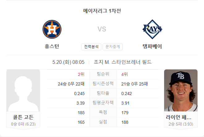 콜튼 고든이 두 번째 선발 등판을 맞이하지만 트리플A에서의 우수한 성적과 첫 경기에서의 가능성을 보여주며 긍정적인 요소로 작용할 수 있습니다. 반면 레이스는 페피오트가 꾸준한 피칭을 이어가고 있으나, 타선이 뒷받침되지 않아 승리로 이어지지 못하고 있습니다. 수비와 마운드의 안정감을 바탕으로 한 애스트로스의 우세가 예상됩니다.