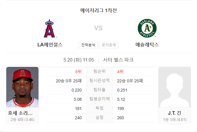 두 팀 모두 불펜이 불안하고, 선발 투수들 또한 믿을 수 있는 자원이 아닙니다. 하지만 에인절스는 최근 다저스를 상대로 타선에서 활발한 모습을 보였고, 소리아노도 직전 경기에서 호투를 펼치며 반등 기미를 보였습니다. 에슬레틱스는 투타 모두에서 부진이 지속되고 있으며, 제이티 진의 복귀전이라는 점에서 변수 요소가 큽니다. 흐름과 타선의 집중력을 고려할 때 에인절스가 근소한 우세를 점할 것으로 보입니다.