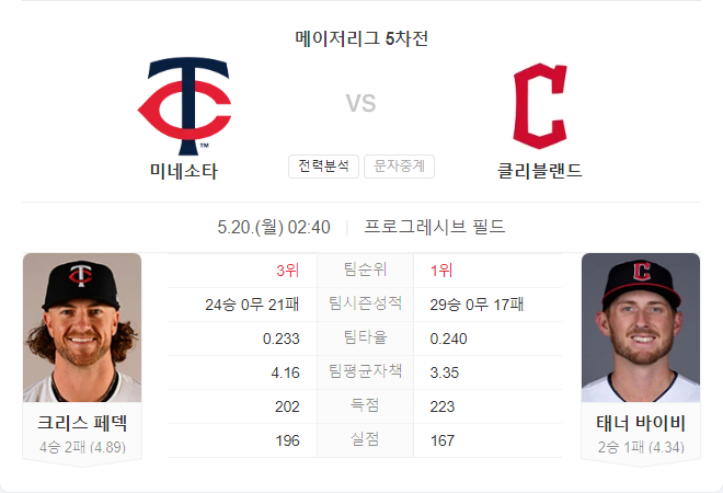 미네소타 트윈스는 최근 원정 경기에서 부진한 모습을 보이고 있으며, 크리스 패덕의 투구도 불안정합니다. 반면, 클리블랜드 가디언스는 최근 좋은 흐름을 이어가고 있으며, 태너 비비의 안정적인 투구를 기대할 수 있습니다. 이번 경기에서 가디언스는 홈 경기의 이점을 살려 승리할 가능성이 높습니다.
