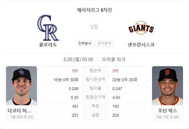 반면, 로키스는 다코타 허드슨이 선발로 나서며 그의 기복 있는 성적이 우려되는 상황입니다. 자이언츠의 타선이 허드슨을 상대로 초반부터 강하게 밀어붙일 것으로 예상되며, 전체적인 경기 흐름을 주도할 가능성이 큽니다.