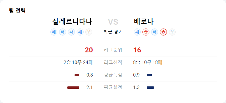 베로나는 현재 승점 34점으로 리그 14위에 자리잡고 있으나, 강등권인 18위 엠폴리와 승점 차이가 단 2점에 불과해 이번 경기에서 반드시 승점이 필요합니다. 반면에 살레르니타나는 이미 다음 시즌 2부 리그로의 강등이 확정된 상태라 큰 동기부여 없이 경기에 임할 것입니다.