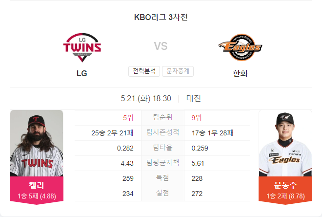 5월 21일 KBO 프로야구 LG 트윈스 VS 한화 이글스 타카짱의 경기 예측 분석