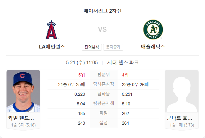 양 팀 모두 불펜이 극심한 부진을 보이고 있는 가운데, 타선의 흐름은 에인절스가 우세합니다. 최근 다저스와의 원정 3연전 스윕으로 분위기를 확실히 끌어올렸고, 헨드릭스 역시 경험 면에서 호글런드를 앞섭니다. 애슬레틱스는 선발과 불펜 모두 불안요소가 많고, 최근 경기력도 하락세입니다.