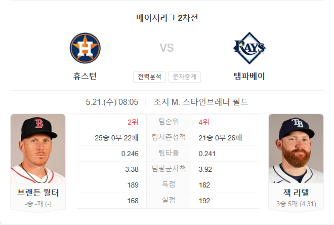 5월 21일 MLB 메이저리그 휴스턴 애스트로스 VS 탬파베이 레이스 타카짱의 경기 예측 분석