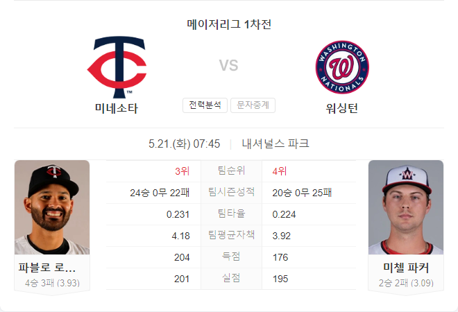 5월 21일 MLB 미네소타 트윈스 VS 워싱턴 내셔널스 타카짱의 경기 예측 분석