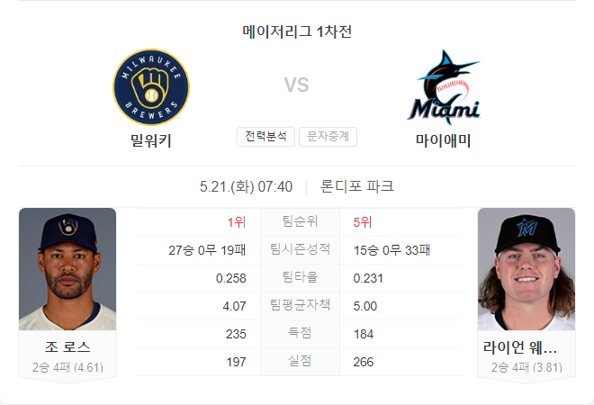 밀워키 브루어스는 최근 좋은 흐름을 이어가고 있으며, 조 로스가 안정적인 투구를 이어갈 가능성이 높습니다. 반면, 마이애미 말린스는 홈 경기에서 득점력이 다소 부족한 모습을 보이고 있습니다. 따라서, 밀워키 브루어스가 이번 경기에서 승리할 가능성이 높습니다.