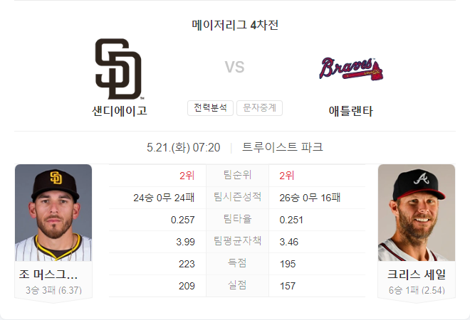 5월 21일 MLB 샌디에이고 파드리스 VS 애틀랜타 브레이브스 2차 타카짱의 경기 예측 분석