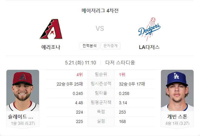 애리조나 다이아몬드백스는 최근 경기에서 어려움을 겪고 있으며, 특히 투수진이 부진한 모습을 보이고 있습니다. 슬레이드 세코니는 최근 3경기에서 7.63 ERA를 기록하며 불안한 모습을 보이고 있습니다. 반면, LA 다저스는 홈 경기에서 강한 모습을 보이며, 가빈 스톤의 안정적인 투구로 인해 승리할 가능성이 높습니다.