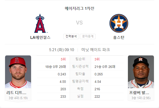 LA 에인절스의 선발 투수 리드 뎃머스는 최근 5경기에서 매우 부진한 모습을 보이며, 총 27.2이닝 동안 26실점을 허용했습니다. 반면, 휴스턴 애스트로스의 선발 투수 프램버 발데즈는 최근 두 경기에서 14이닝 동안 8안타와 2실점만을 허용하며 안정적인 모습을 보였습니다.