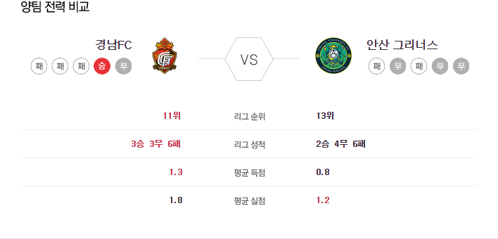경남이 체급에서는 앞서지만, 주요 선수들의 결장이 큰 영향을 미칠 수 있다. 안산의 끈끈한 수비가 경남의 공격을 억제할 가능성이 높다. 무승부가 예상된다.