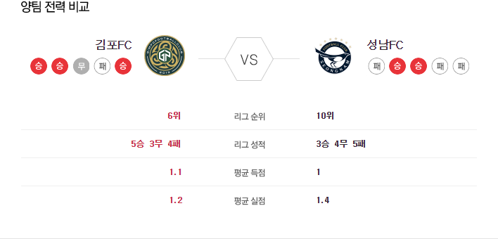 김포는 수비적인 조직력이 상당히 올라온 모습이다. 성남에게는 올 시즌 조직력이 망가진 초반에 패배하기 전까지 무패를 기록하면서 강세를 보였다. 결장자는 없으며, 총 전력에 대비해 -0%의 영향을 받고 있다.