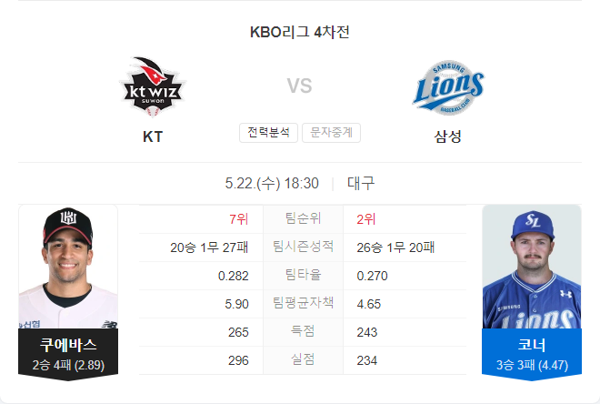 5월 22일 KBO 프로야구 KT 위즈 VS 삼성 라이온즈 타카짱의 경기 예측 분석