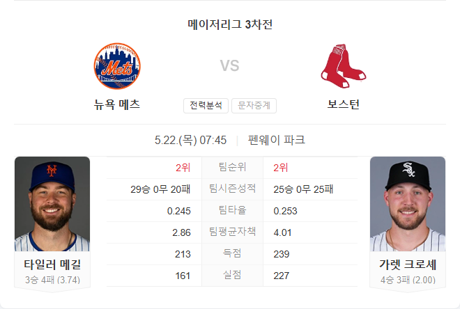 보스턴은 크로셰의 안정적인 피칭과 상위권 타선의 활약으로 이번 경기에서 유리한 고지를 점하고 있습니다. 메츠는 메길의 최근 난조와 타선의 기복이 문제이며, 원정 경기에서 수세에 몰릴 가능성이 큽니다. 다만, 메츠의 마운드 전체 성적은 리그 최상위권으로, 크로셰를 상대로 장타 한 방을 통해 흐름을 뒤집을 가능성도 배제할 수는 없습니다. 하지만 최근 경기력과 선발 매치업을 종합적으로 고려할 때 보스턴의 승리가 유력해 보입니다.