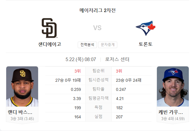 선발 등판하는 랜디 바스케스는 시즌 3승 3패, 평균자책 3.45를 기록 중이며, 5월 들어 3경기에서 2.12의 평균자책을 기록하며 안정적인 피칭을 이어가고 있습니다. 그러나 토론토 상대로는 지난 시즌 5이닝 4실점(비자책 3점)으로 패전한 경험이 있으며, 상대 타자들에게 5타수 5안타, 3루타 1개, 홈런 1개를 허용하는 등 상성 면에서는 불안한 요소가 존재합니다.