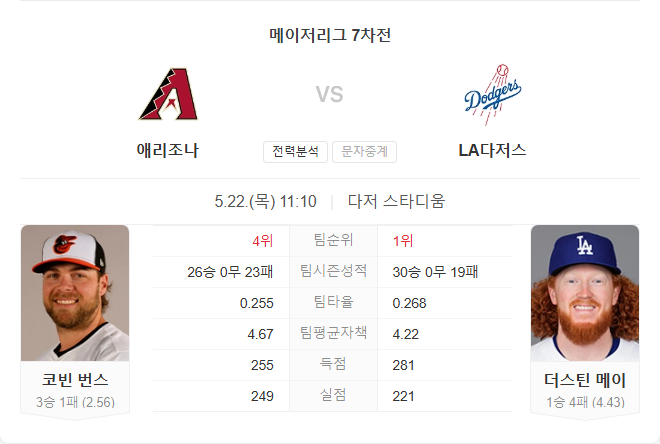 다저스는 강한 타선을 보유하고 있지만, 현재 마운드 붕괴와 연패 흐름으로 경기 주도권을 잡기 어려운 상황입니다. 반면 다이아몬드백스는 불펜이 불안하긴 하나 선발 코빈 번스의 최근 경기력은 리그 최정상급이며, 이미 다저스를 상대로도 좋은 투구 내용을 남긴 바 있습니다. 선발 매치업에서 뚜렷한 우위를 보이는 다이아몬드백스가 이번 경기에서도 원정 승리를 거둘 가능성이 높습니다.