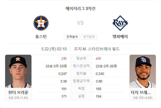 휴스턴은 강력한 선발 브라운을 앞세워 시리즈를 마무리할 기세입니다. 반면 레이스는 브래들리의 불안정한 제구와 애스트로스전 약점을 극복하지 못한다면 또다시 고전할 가능성이 높습니다. 최근 타선의 집중력에서도 애스트로스가 우세한 흐름을 보이고 있어, 선발과 타선 모두 우위를 점하는 애스트로스가 승리에 가까워 보입니다.