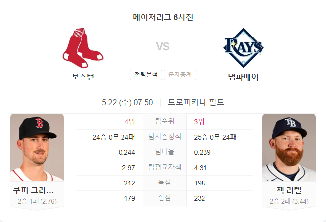 탬파베이 레이스는 보스턴 레드삭스를 상대로 최근 좋은 성적을 거두고 있습니다. 특히, 최근 맞대결에서도 탬파베이는 보스턴을 상대로 강한 모습을 보였습니다. 이번 경기도 탬파베이의 우세가 예상됩니다. 크리스웰과 리텔의 최근 성적을 고려할 때, 탬파베이는 보스턴보다 더 안정적인 투구를 보여줄 가능성이 큽니다.